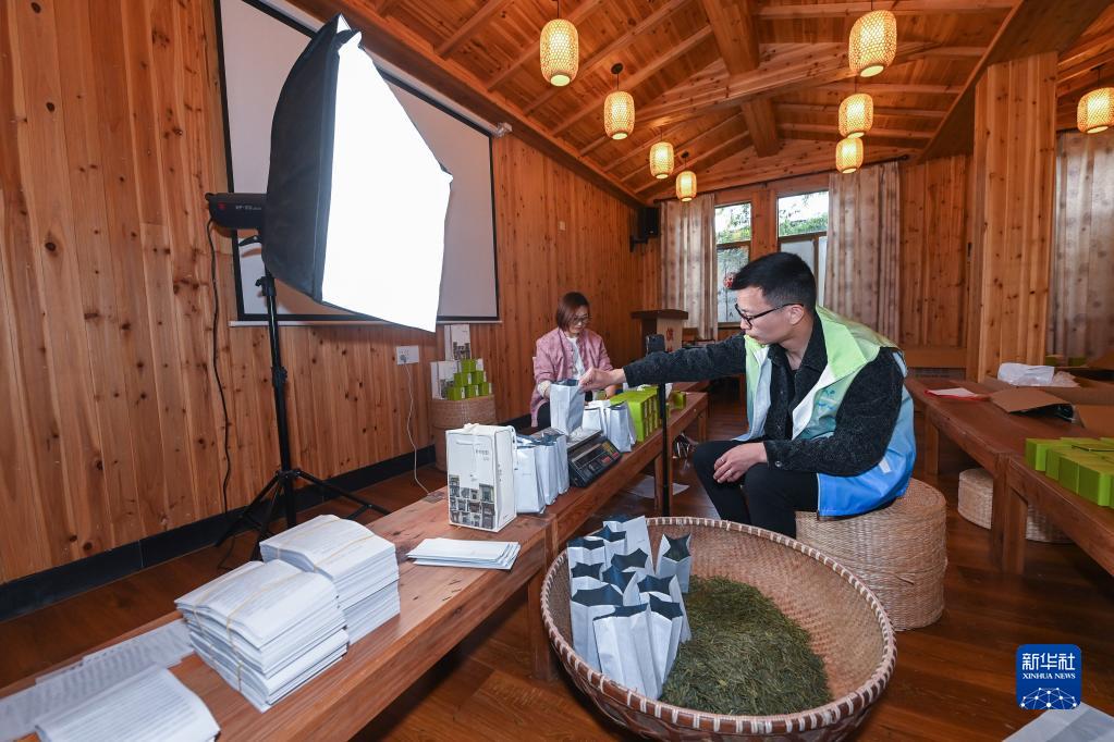 4月13日,在諸暨市東白湖鎮斯宅村“裕昌號恒諾甄選共富工坊”內,志愿者(右)對斯宅石筧茶進(jìn)行裝袋稱(chēng)重。