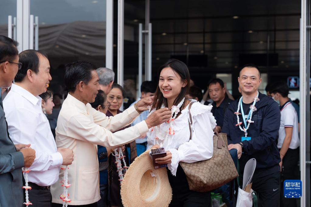 4月13日,在中老鐵路老撾磨丁站,老撾官員和工作人員歡迎乘坐D887次國際旅客列車(chē)的旅客抵達磨丁。