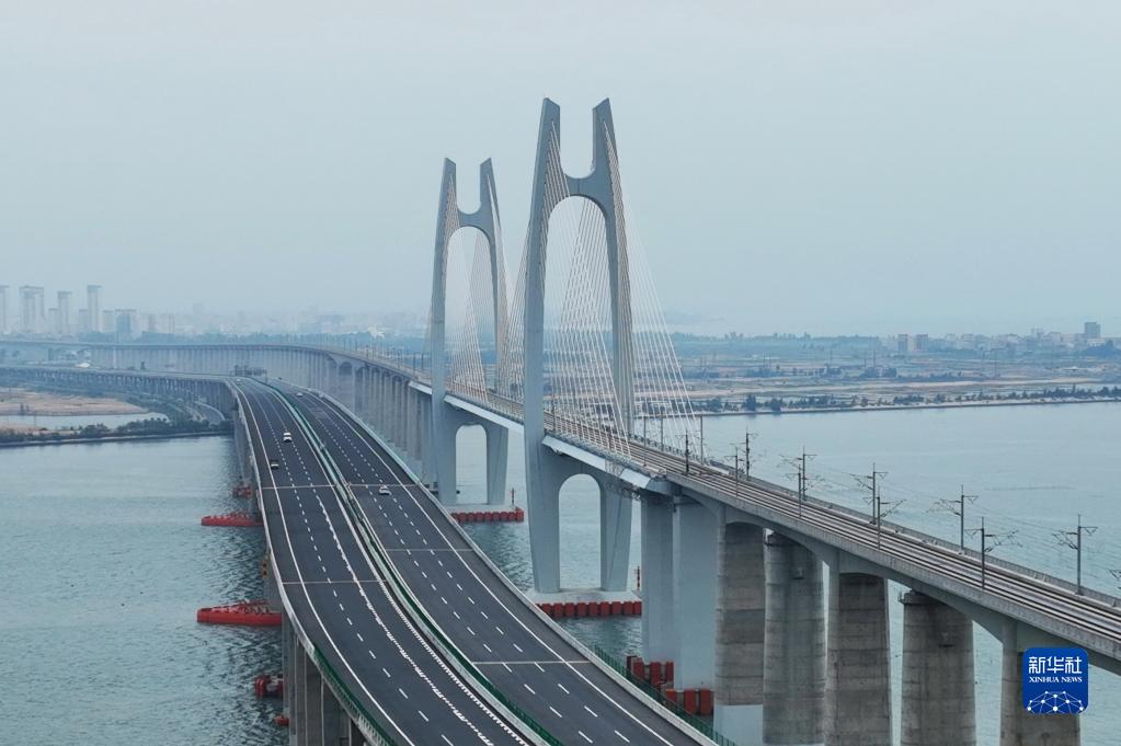 4月12日拍攝的新建福廈鐵路安海灣跨海大橋(右)(無(wú)人機照片)。