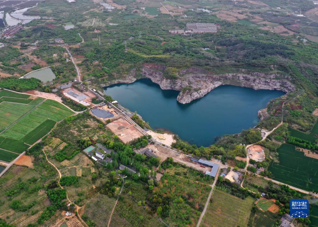 “深藍計劃”所在的廢棄礦坑(4月13日攝,無(wú)人機照片)。這個(gè)礦坑深達108米,原本廢棄多年,如今已是網(wǎng)紅打卡地。