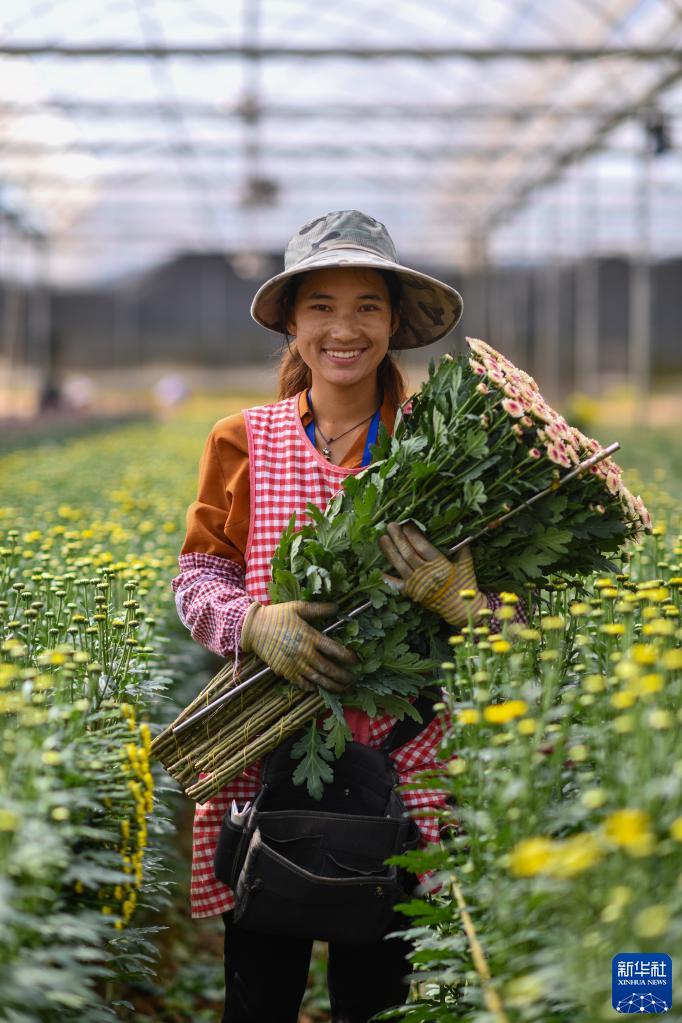 云南省開(kāi)遠市的花農項麗珍在展示采摘的鮮花(3月22日攝)。