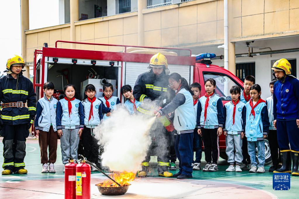 4月13日,在江西省撫州市南豐縣傅坊鄉中心小學(xué),消防員為學(xué)生示范滅火器的使用方法。