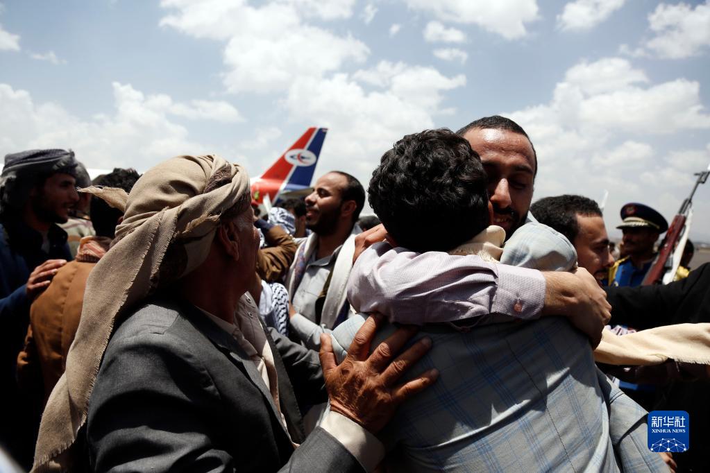 4月14日,在也門(mén)薩那機場(chǎng),獲釋胡塞武裝成員戰俘下飛機后與家人擁抱。