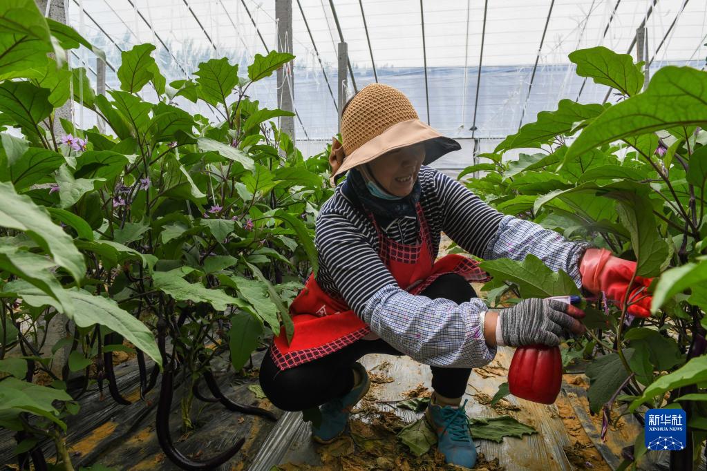 4月14日,山東省泰安市岱岳區范鎮鄭寨子村農業(yè)合作社社員在蔬菜大棚內為茄子授粉。