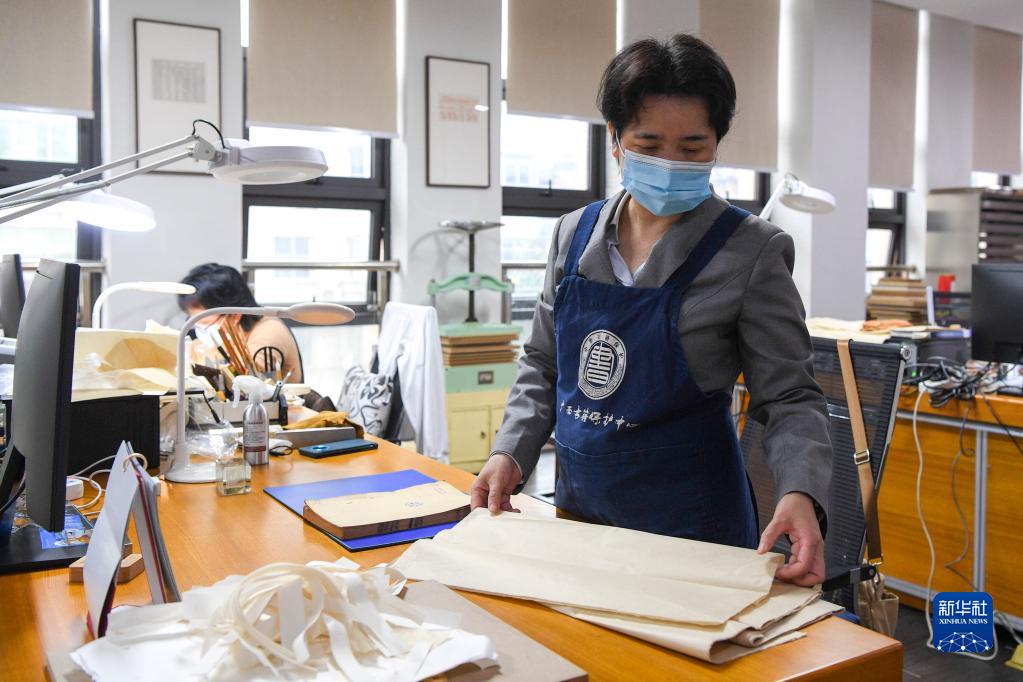 4月14日,在廣西壯族自治區圖書(shū)館古籍保護中心的工作室內,黃玉杏在整理修復古籍使用的紙張。