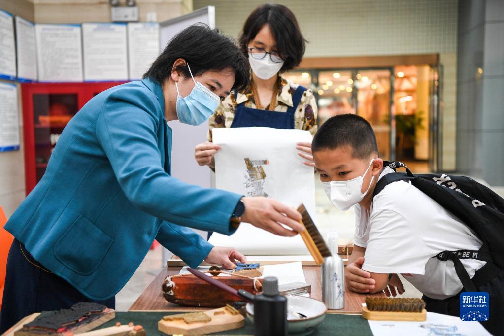 4月15日,在廣西壯族自治區圖書(shū)館,黃玉杏(左)給小讀者講解古籍印刷的有關(guān)知識。
