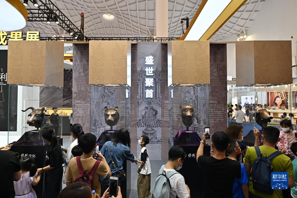 4月15日,參觀(guān)者在消博會(huì )保利展臺觀(guān)看由保利藝術(shù)博物館收藏的圓明園獸首銅像復制品。
