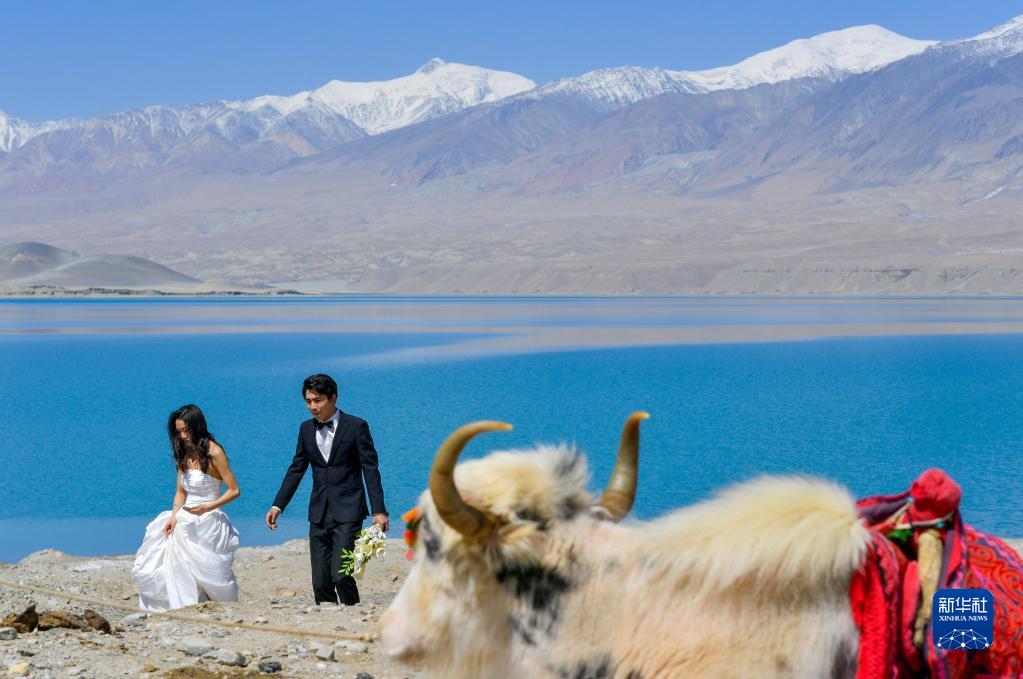 4月14日,在白沙湖風(fēng)景區,一對年輕人在湖邊拍攝婚紗照。