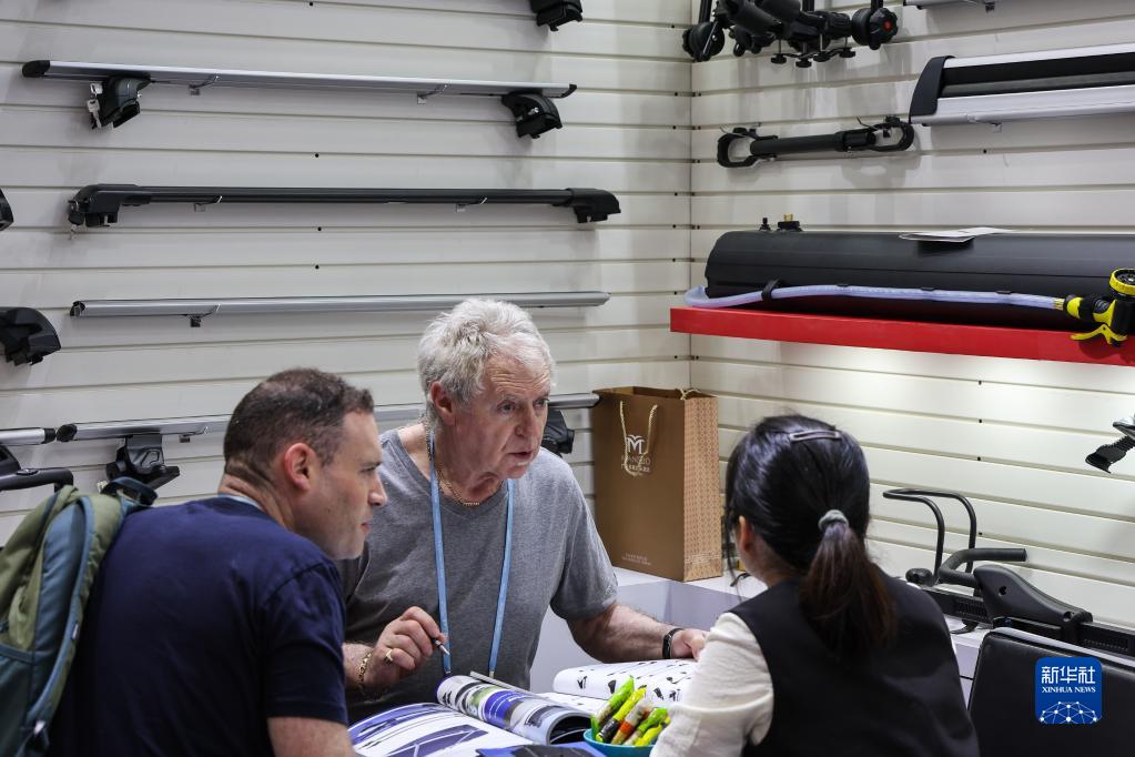 4月15日,來(lái)自英國的采購商在廣交會(huì )汽配展區洽談行李架產(chǎn)品。