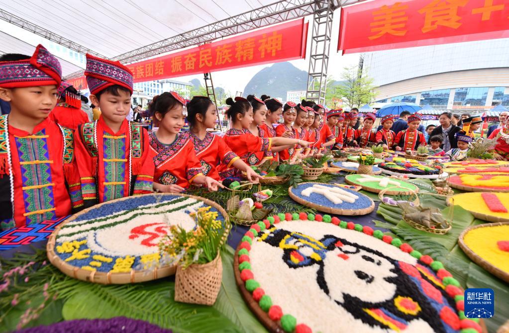 當日,廣西河池市大化瑤族自治縣舉辦“美味三月三”美食大賽,當地各族群眾以糯米、七百弄雞、山羊、河魚(yú)等當地特色食材制作的數百道美食參加評比。
