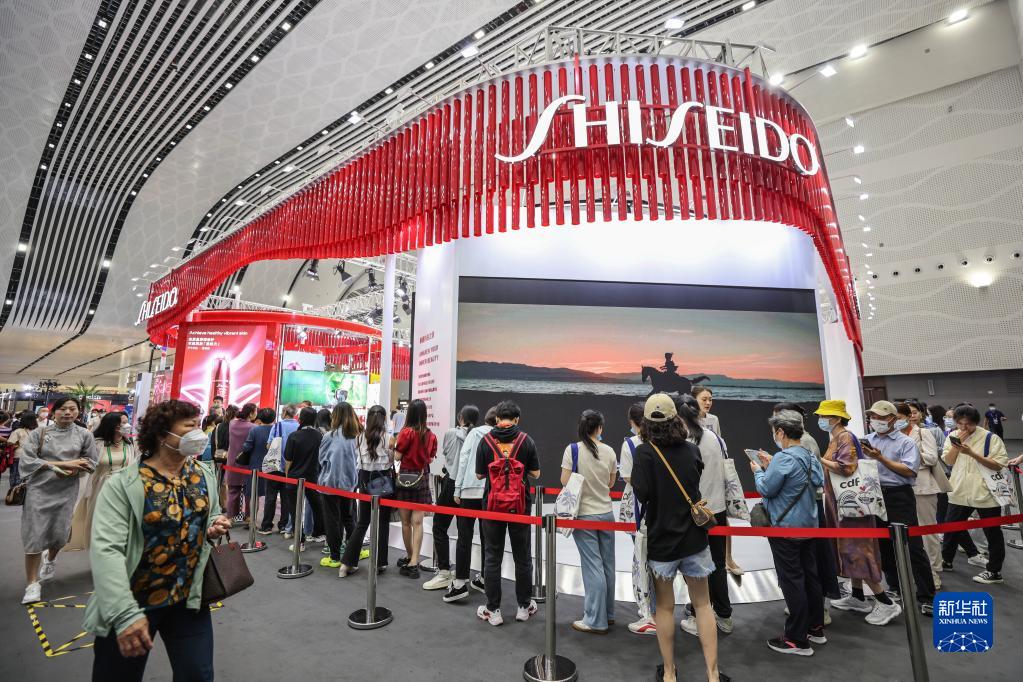 4月13日,觀(guān)眾在消博會(huì )資生堂展臺排隊參加活動(dòng)。新華社記者 張麗蕓 攝