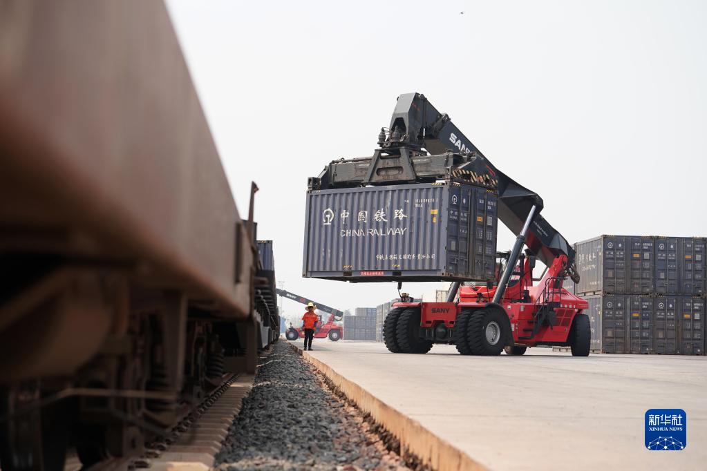 4月15日,老中鐵路公司的員工在老撾萬(wàn)象南站裝運貨物。
