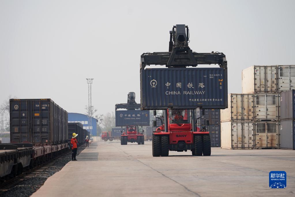 4月15日,老中鐵路公司的員工在老撾萬(wàn)象南站裝運貨物。