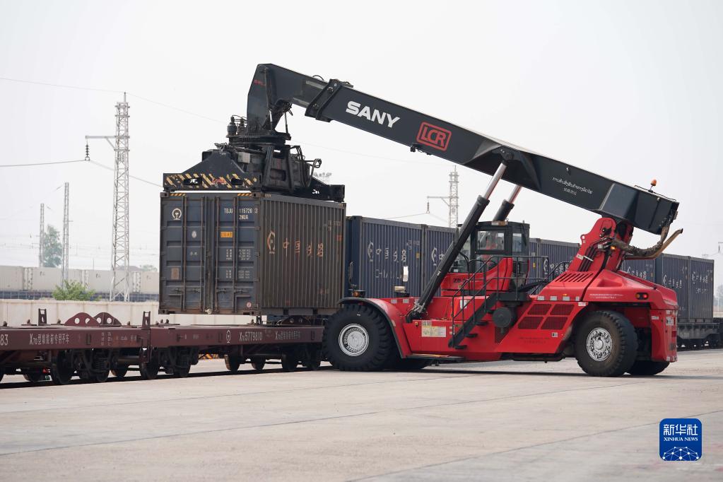 4月15日,老中鐵路公司的員工在老撾萬(wàn)象南站裝運貨物。