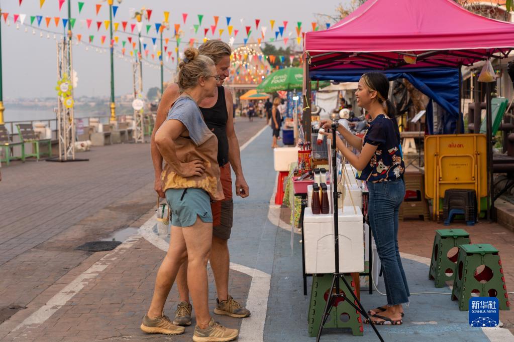 4月12日,在泰國廊開(kāi),兩名外國游客與一名當地商販交談。新華社記者 林昊 攝