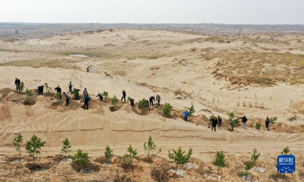 4月15日,在內蒙古通遼市科爾沁左翼后旗,治沙工人在科爾沁沙地植樹(shù)造林(無(wú)人機照片)。