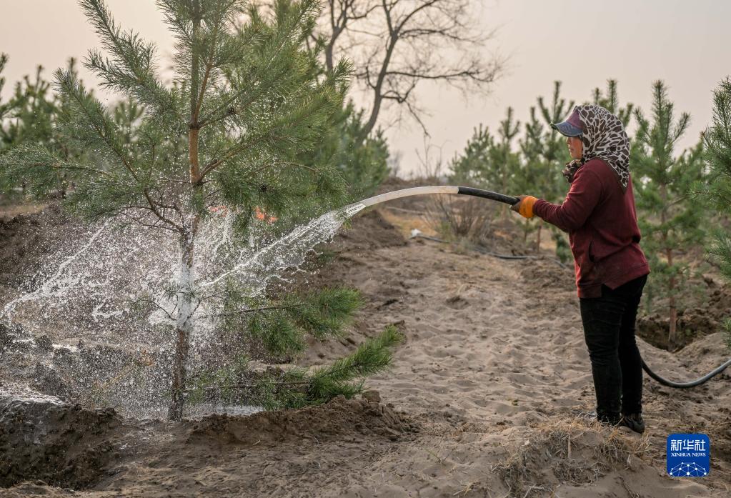4月15日,在內蒙古通遼市科爾沁左翼后旗,治沙工人在科爾沁沙地給樹(shù)木澆水。