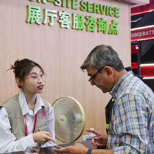 4月15日,廣交會(huì )服務(wù)人員在展館為來(lái)賓提供咨詢(xún)。