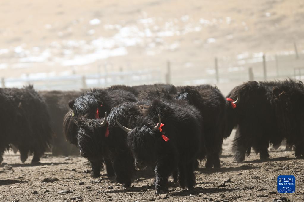 這是4月14日拍攝的剛察縣環(huán)湖型牦牛良種繁育基地內的環(huán)湖型長(cháng)毛牦牛。 新華社記者 張龍 攝