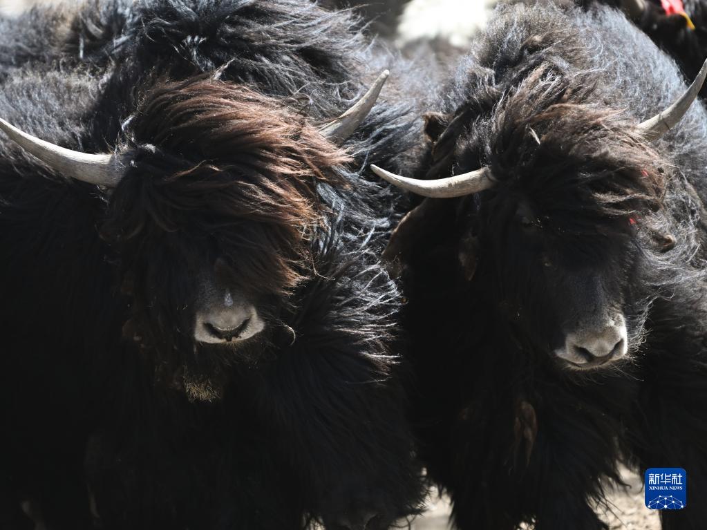 這是4月14日拍攝的剛察縣環(huán)湖型牦牛良種繁育基地內的環(huán)湖型長(cháng)毛牦牛。 新華社記者 張龍 攝