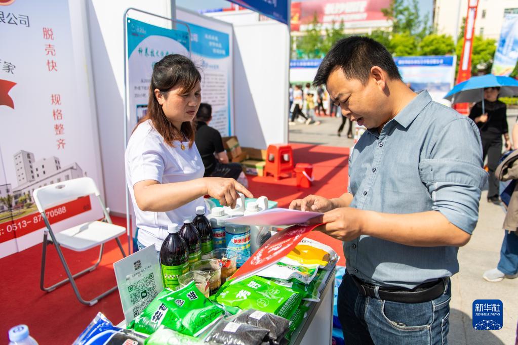 4月16日,在益陽(yáng)市南縣南洲廣場(chǎng),觀(guān)眾(右)在了解龍蝦養殖飼料。