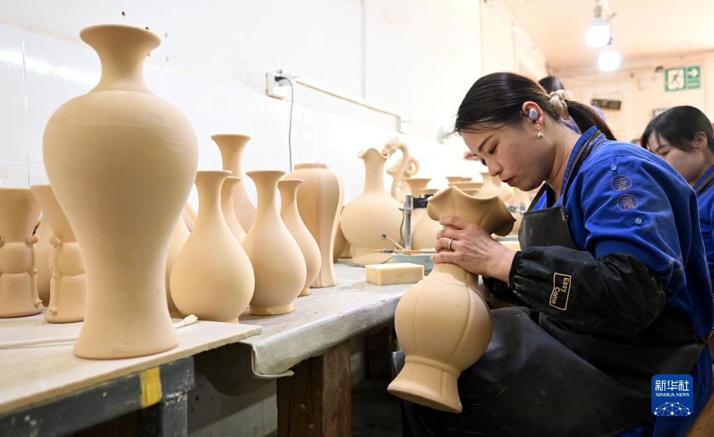 4月13日,在河南省汝州市一家汝瓷生產(chǎn)車(chē)間內,工人在進(jìn)行汝瓷生產(chǎn)作業(yè)。