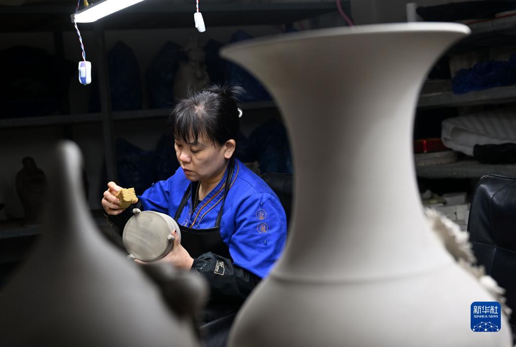4月13日,在河南省汝州市一家汝瓷生產(chǎn)車(chē)間內,工人在進(jìn)行汝瓷生產(chǎn)作業(yè)。