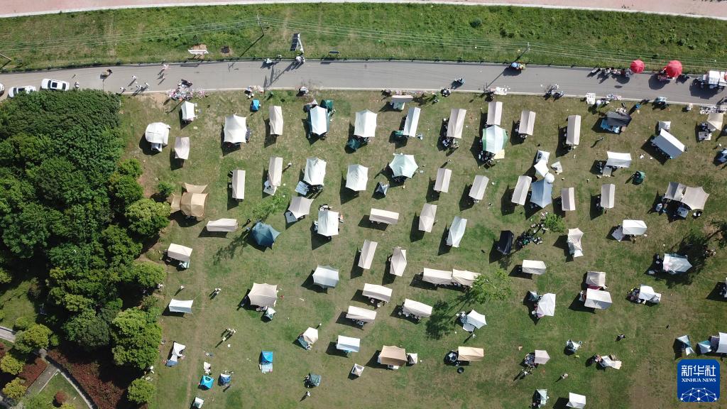 4月16日,市民在長(cháng)沙市開(kāi)福區湘江畔露營(yíng)休閑(無(wú)人機照片)。