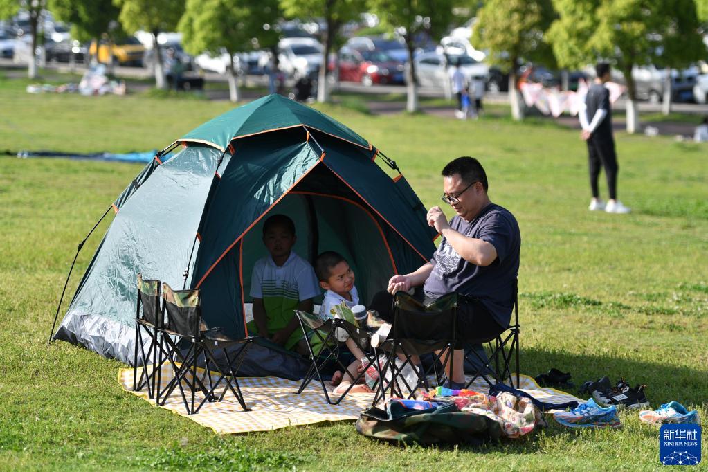 4月16日,市民在長(cháng)沙市開(kāi)福區湘江畔露營(yíng)休閑。