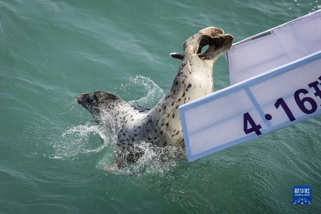 4月16日,一頭西太平洋斑海豹躍入海中。