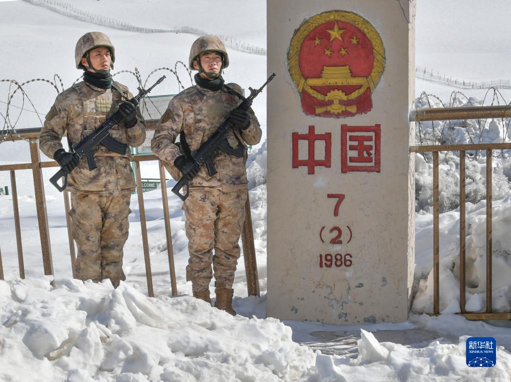 4月13日,周林平(右)和高光輝在中國和巴基斯坦邊境7號界碑處執勤。