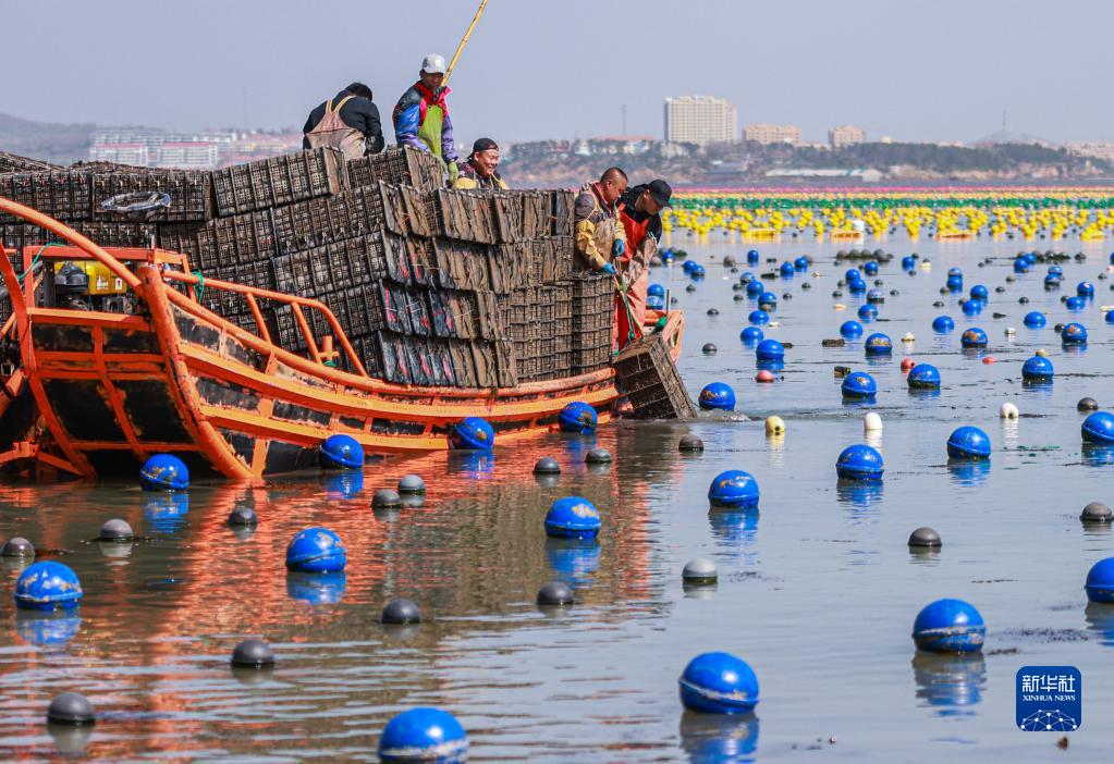 4月16日,在山東省榮成市愛(ài)倫灣海域,養殖工人們駕駛漁船將鮑魚(yú)投放至養殖海區繼續養殖。