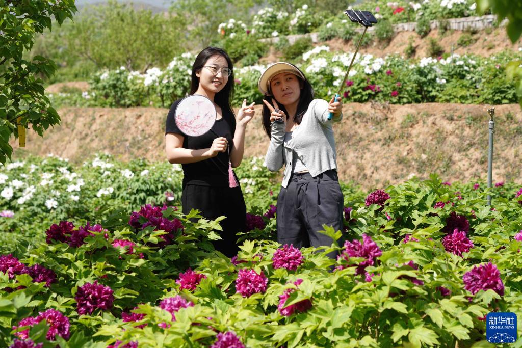 4月16日,游客在白臺峪村牡丹農業(yè)產(chǎn)業(yè)園拍照游玩。