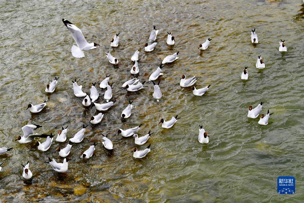 拉薩河上的一群棕頭鷗(4月16日攝)。