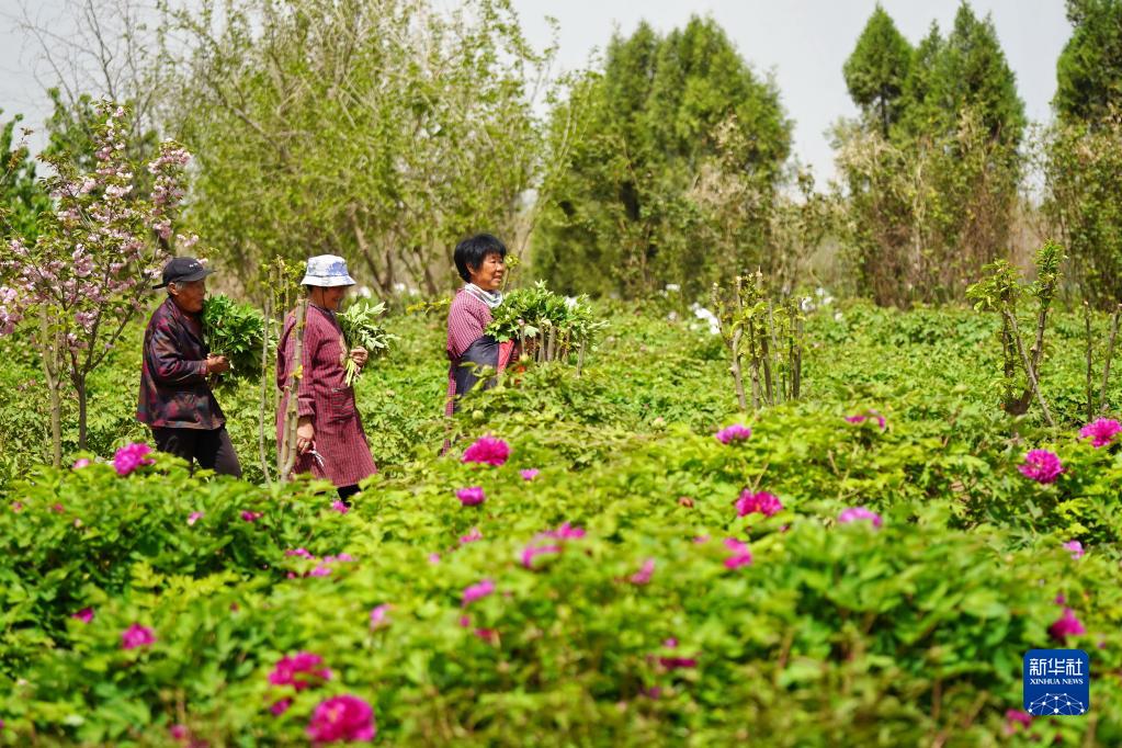 4月17日,河北省柏鄉縣十里鋪村花農在牡丹種植園里運送剛剛采摘的牡丹鮮切花。