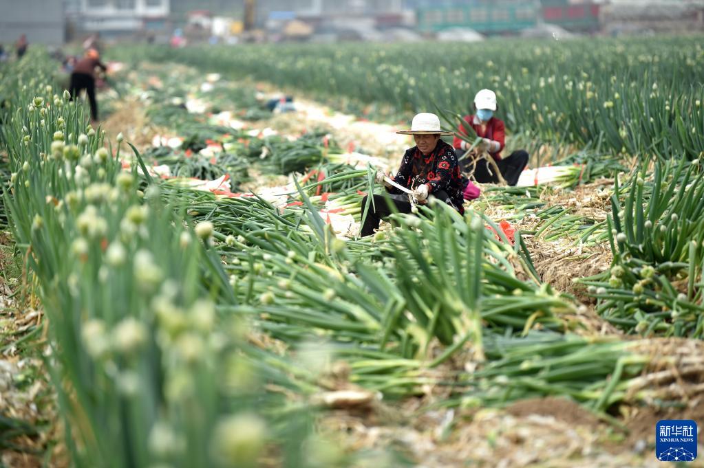 4月17日,在河北省石家莊市欒城區城郎村,農民忙著(zhù)收獲大蔥。