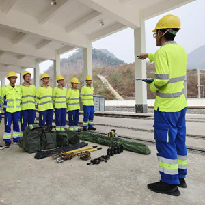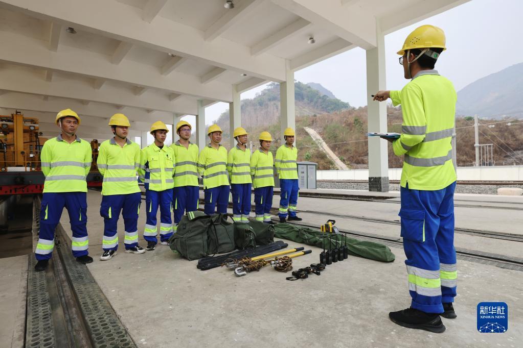 4月17日,瑯勃拉邦維保管理中心的工人在老撾瑯勃拉邦站附近進(jìn)行接觸網(wǎng)維修保養演練。