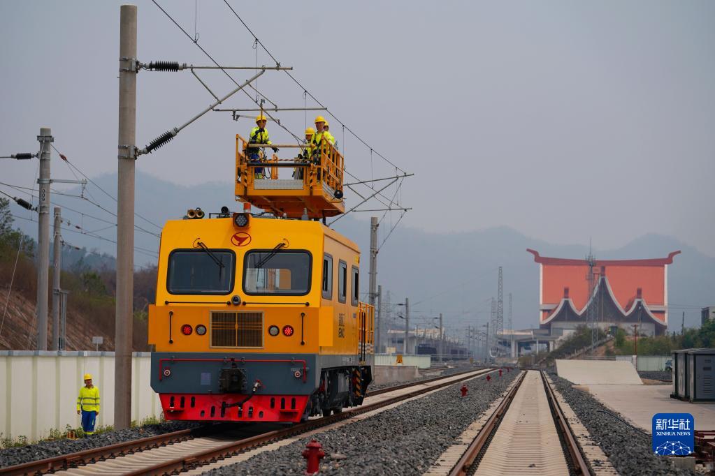 4月17日,瑯勃拉邦維保管理中心的工人在老撾瑯勃拉邦站附近進(jìn)行接觸網(wǎng)維修保養演練。