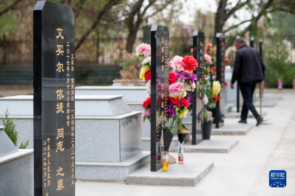 4月16日,在葉城烈士陵園,艾尼瓦爾·艾買(mǎi)爾查看柏樹(shù)苗的長(cháng)勢。他的父親艾買(mǎi)爾·依提去世后被安葬在陵園內。