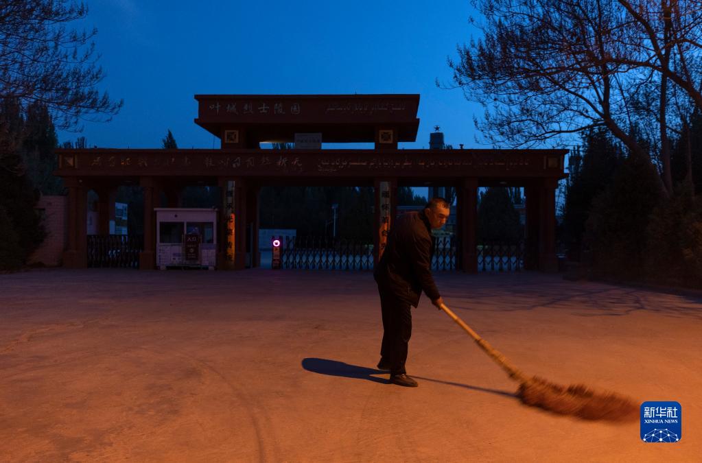 4月16日,天還不亮,艾尼瓦爾·艾買(mǎi)爾來(lái)到陵園大門(mén)口打掃衛生。