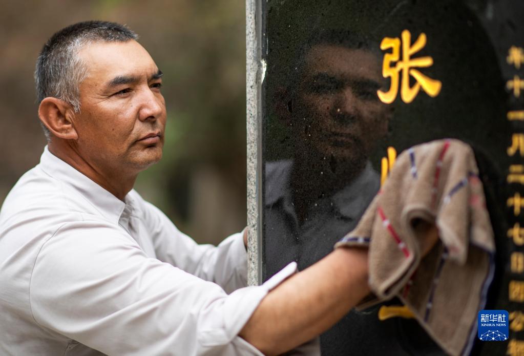 4月16日,艾尼瓦爾·艾買(mǎi)爾在葉城烈士陵園擦拭墓碑。