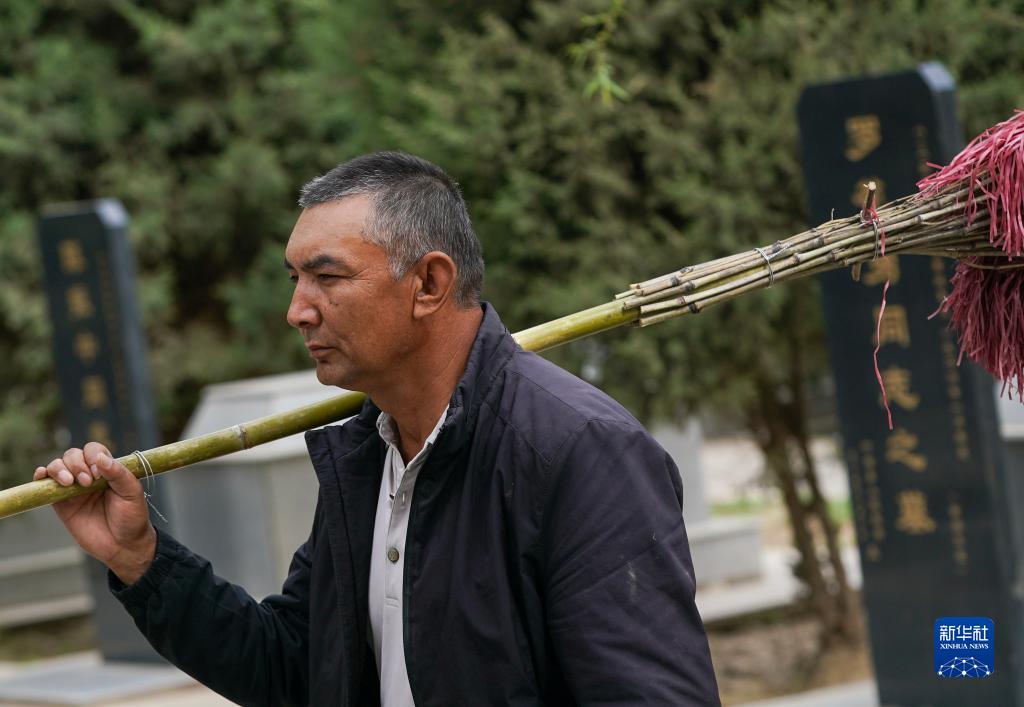 4月16日,在新疆葉城烈士陵園,艾尼瓦爾·艾買(mǎi)爾肩扛掃把準備去打掃陵園。