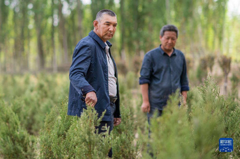 4月16日,艾尼瓦爾·艾買(mǎi)爾(左)在葉城一處種苗場(chǎng)挑選柏樹(shù)苗。