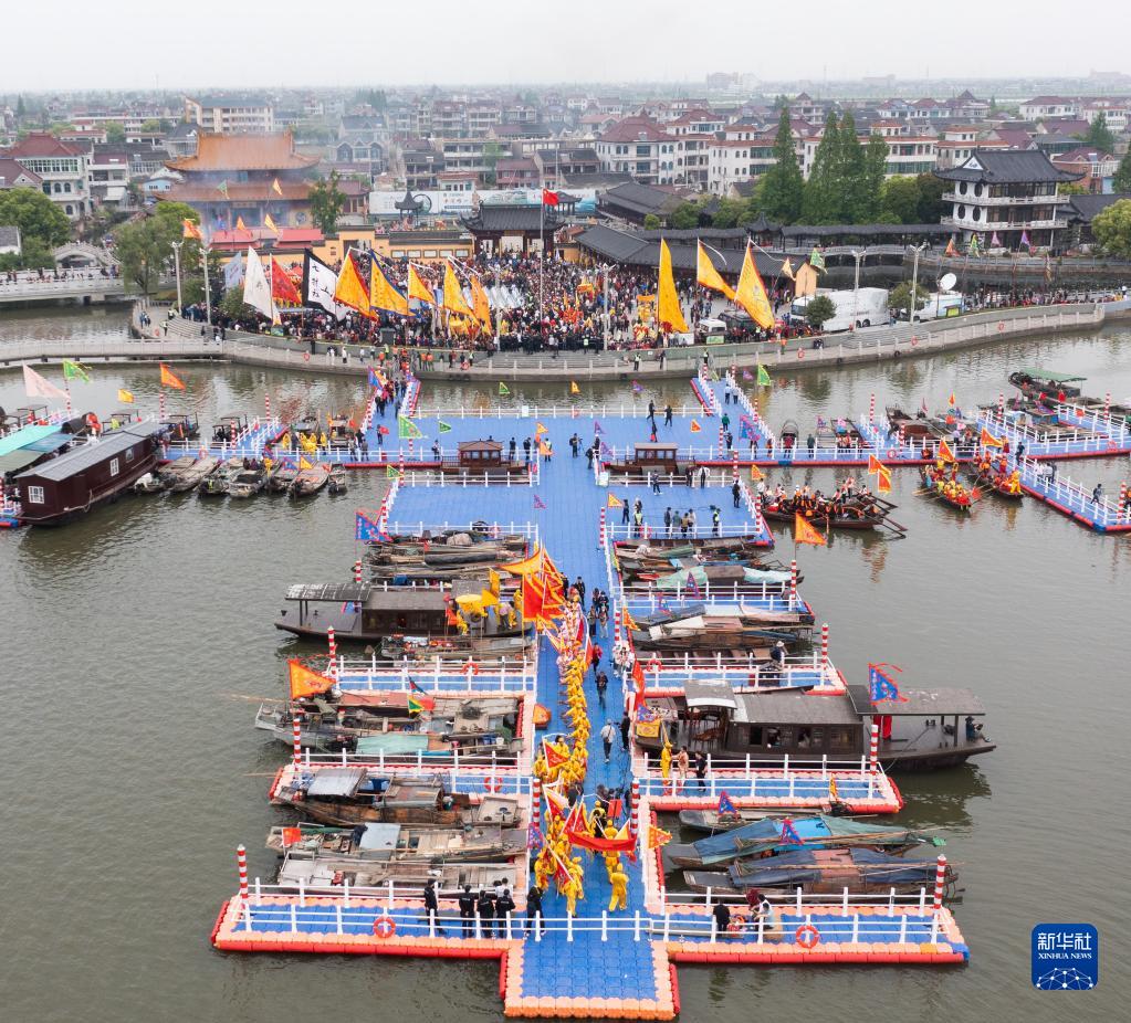 4月18日,民俗巡游在王江涇鎮蓮泗蕩的網(wǎng)船會(huì )現場(chǎng)舉行(無(wú)人機照片)。