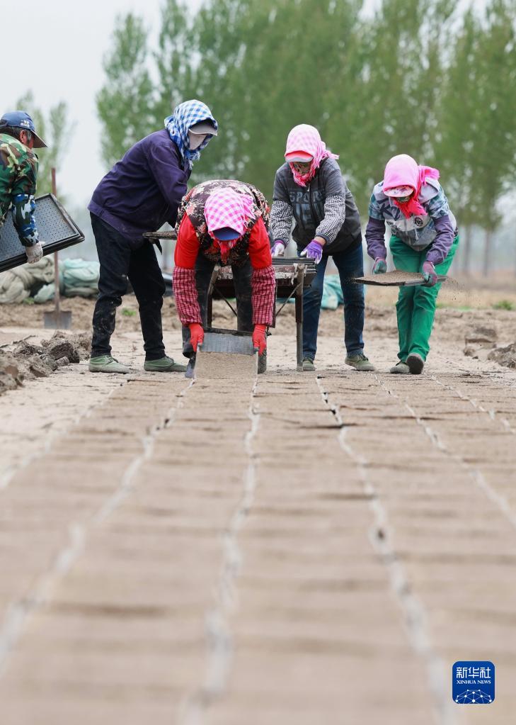 4月18日,唐山市豐南區西葛鎮的農民在田間擺放育秧盤(pán)。