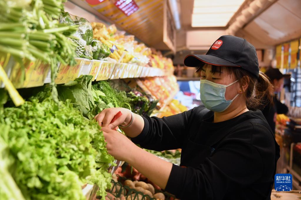 4月18日,在位于北京市朝陽(yáng)區柳芳公交場(chǎng)站東北角的“公交便民驛?!?,工作人員在碼放蔬菜。