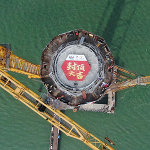 4月18日,由保利長(cháng)大承建的黃茅海大橋中塔順利封頂。至此,黃茅??绾Mǖ赖母邫诟鄞髽蚝忘S茅海大橋共5座主塔全部封頂。