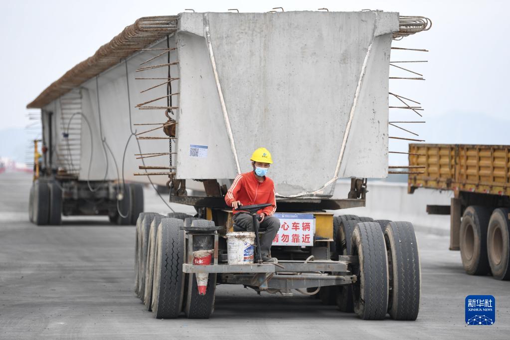 4月18日,工人在黃茅??绾Mǖ傈S茅海大橋上運輸橋梁預制件。