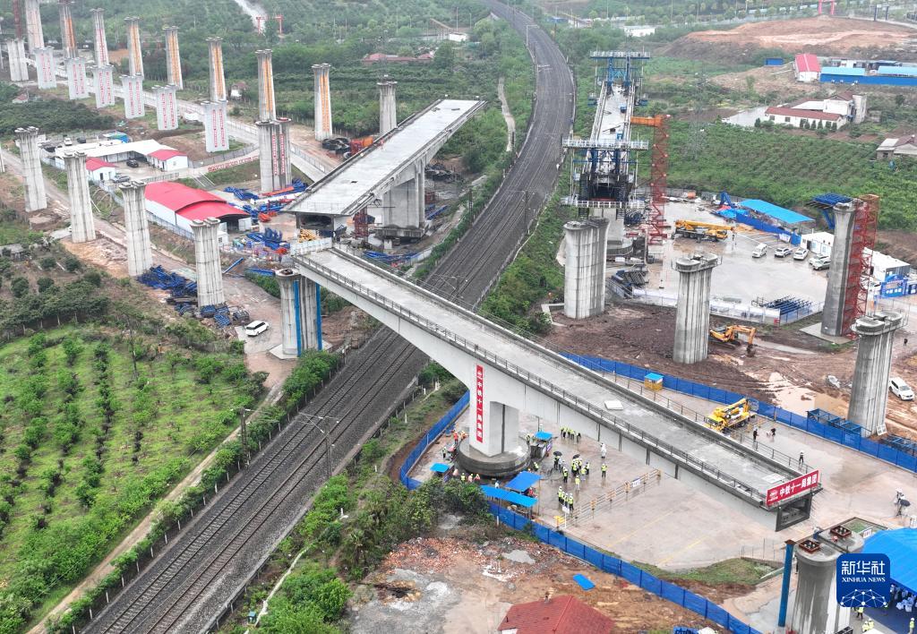 滬渝蓉高速鐵路荊門(mén)特大橋跨焦柳鐵路連續梁完成轉體(4月18日攝,無(wú)人機照片)。
