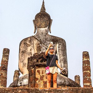 4月16日,游客在泰國素可泰古城遺址拍照。